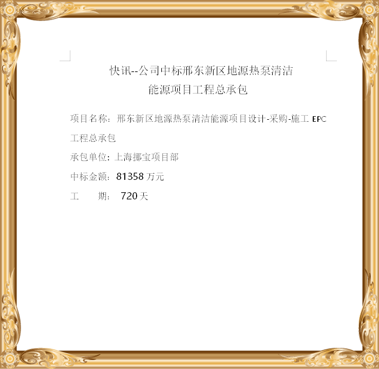 快讯--公司中标邢东新区地源热泵清洁 能源项目工程总承包