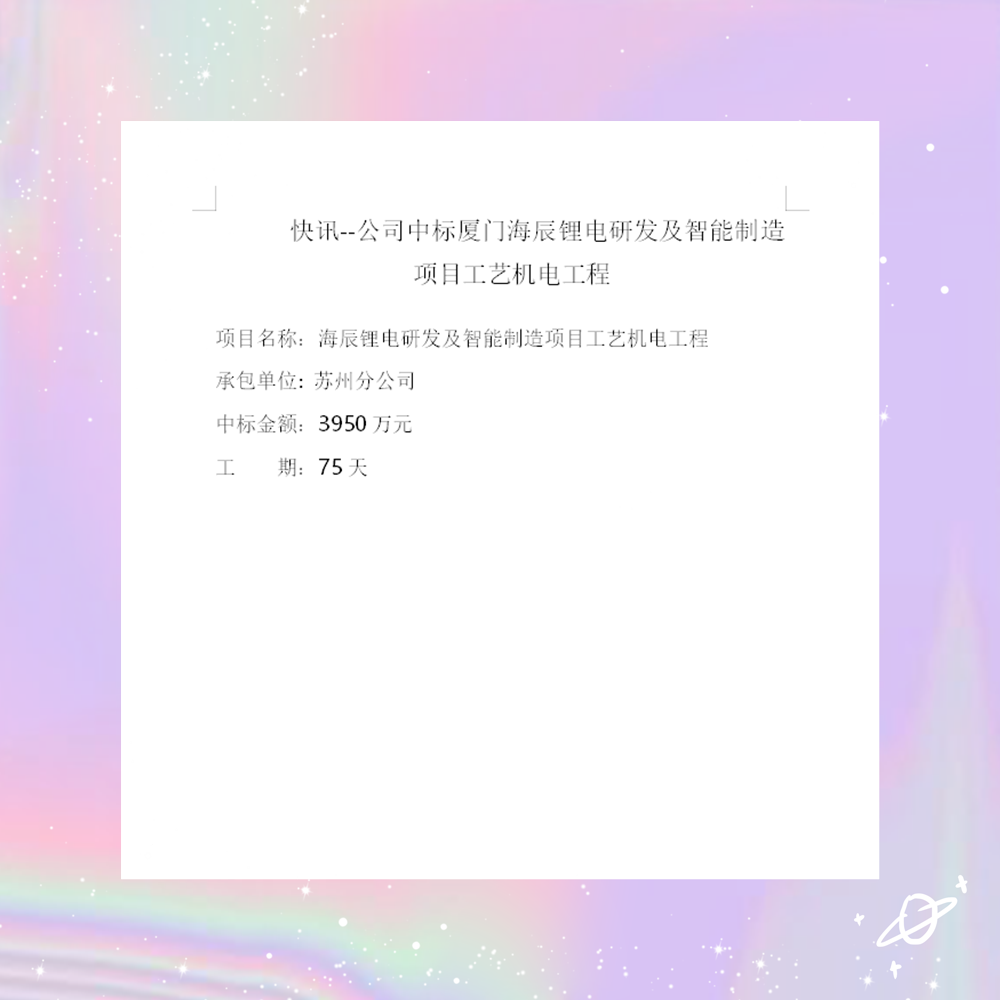 快讯--公司中标厦门海辰锂电研发及智能制造项目工艺工程