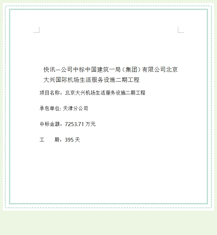 快讯—公司中标中国建筑一局(集团)有限公司北京大兴国际机场生活服务设施二期工程