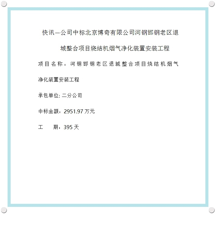 快讯—公司中标北京博奇有限公司河钢邯钢老区退城整合项目烧结机烟气净化装置安装工程