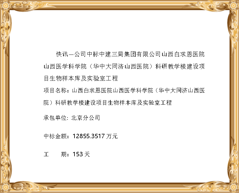 快讯一公司中标中建三局集团有限公司山西白求恩医院山西医学科学院(华中大同济山西医院) 科研教学楼建设项目生物样本库及实验室工程