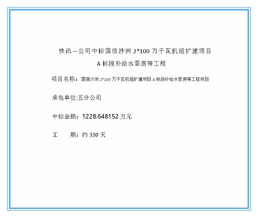 快讯一公司中标国信沙洲2*100万千瓦机组扩建项目A标段补给水泵房等工程
