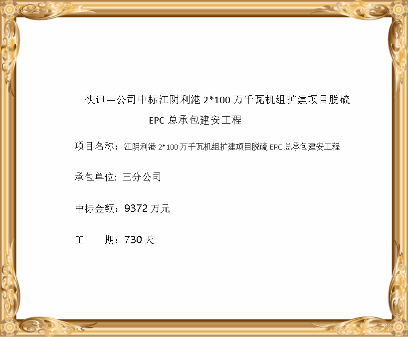 快讯一公司中标江阴利港2*100万千瓦机组扩建项目脱硫EPC总承包建安工程