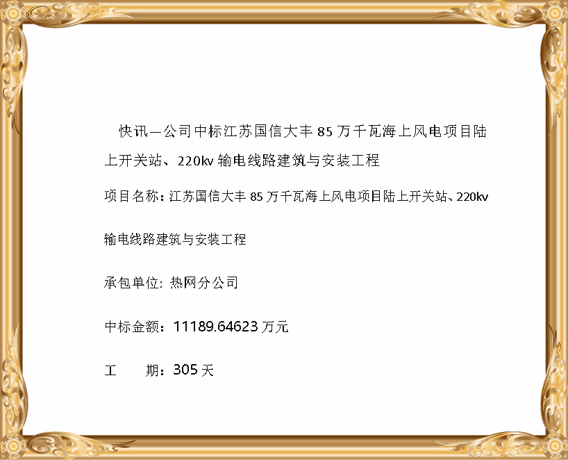 快讯一公司中标江苏国信大丰85 万千瓦海上风电项目陆上开关站、220kv输电线路建筑与安装工程