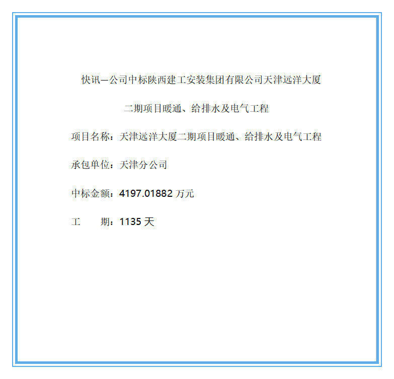 快讯一公司中标陕西建工安装集团有限公司天津远洋大厦