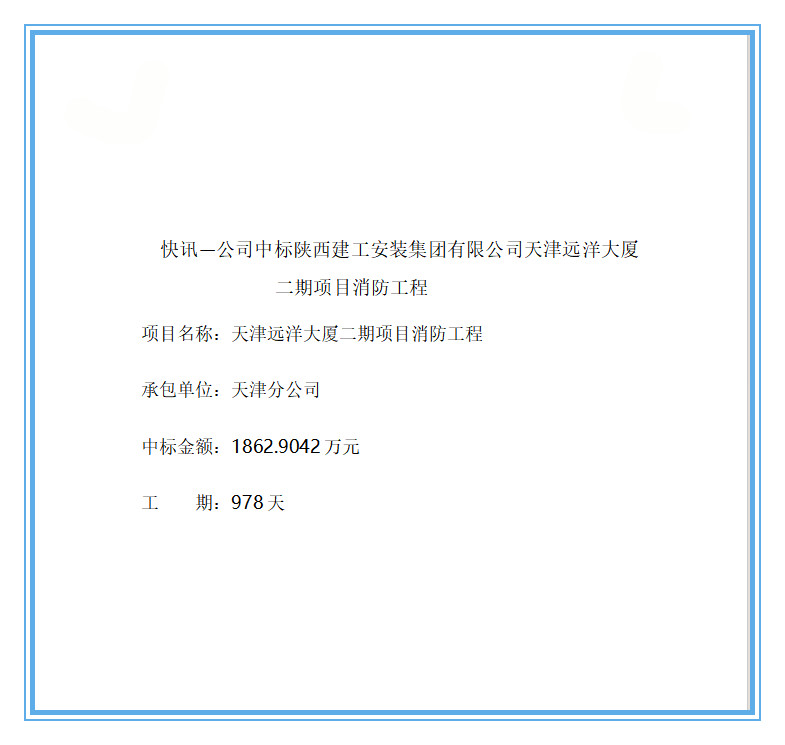 快讯一公司中标陕西建工安装集团有限公司天津远洋大厦二期项目消防工程