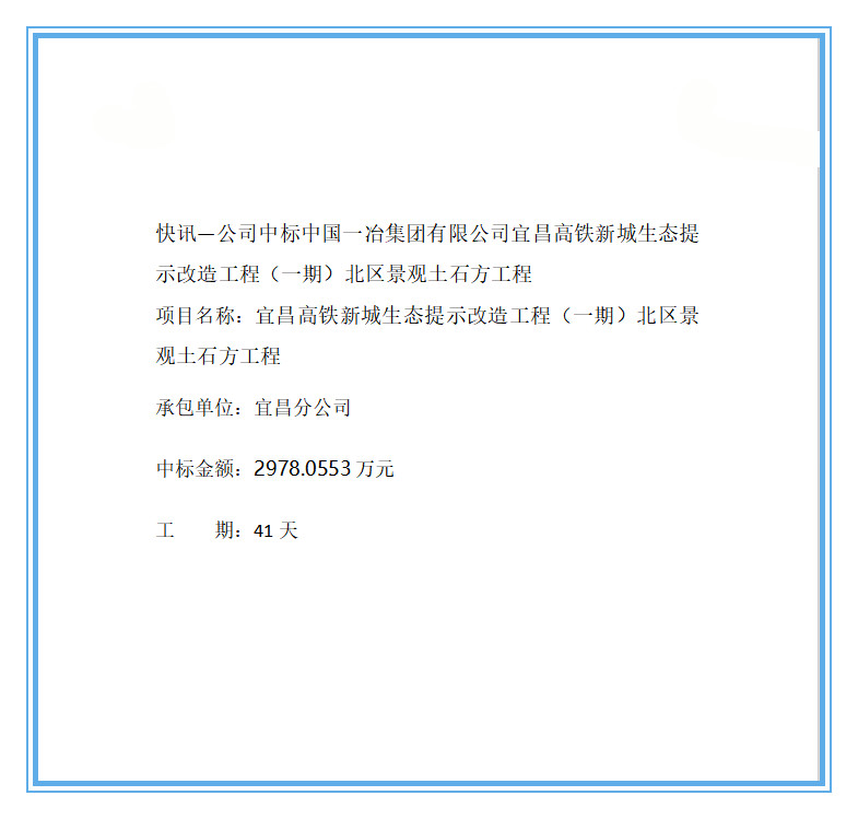 快讯一公司中标中国一冶集团有限公司宣昌高铁新城生态提示改造工程(一期)北区景观土石方工程