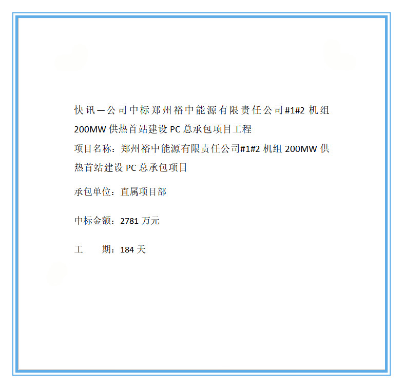 快讯-公司中标郑州裕中能源有限责任公司#1#2机组200MW供热首站建设PC总承包项目工程
